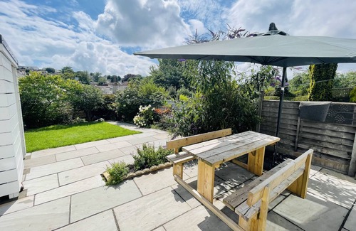 The garden is fully enclosed and consists of a large patio with a picnic bench & umbrella, lawn and has lovely views over the hills.