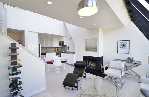 This totally redone apartment features classic modern furnishings, including a Saarinen tulip table and chairs in the dining area. The apartment has three floors, with the common areas on the second floor, the master bedroom suite on the first floor and the guest bedroom and bath on the third floor overlooking the living room. The combination kitchen/dining/living room has double walls of glass windows offering a comfortable aerie to relax and unwind. The living room has classic mid-century modern furnishings, a Bang&Olufsen music system and a large flat screen TV. Relax and have drink from the bar cart before heading out to dinner or a show.