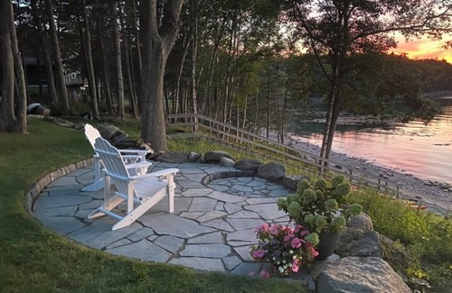 Two stone patios, perched above the breathtaking 200-foot waterfront on Penobscot Bay, offer a perfect spot to unwind and enjoy the spectacular sunsets. Evening cocktails while watching the sunset is a popular pastime among guests.