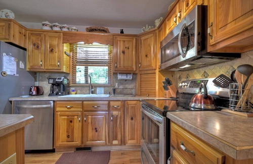 Magnificent Unobstructed Long Range Mountain Views from Every Room! Lil Bit O Heaven has something for everyone. It's spacious, cozy, close to town, hiking, and state parks. This cabin is also motorcycle friendly-- all paved access and a half circle driveway perfect for parking a trailer. Lil Bit O Heaven offers 2 master suites with spacious Full Private bathrooms and spacious closet space, and generous drawer space. The Queen bedroom on the main level has a complete full bathroom across the hallway in the Laundry room. In addition, it boasts a hot tub, main level screened in porch, terrace level screened in porch, fenced in yard, and a firepit.