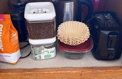 No matter how you like you coffee brewed, we have what you need including: a Kurig (with K-cups), a 12 cup drip coffee maker and filters, a coffee grinder and a French Press. We also provide a few snacks and breakfast items for our guest convenience.