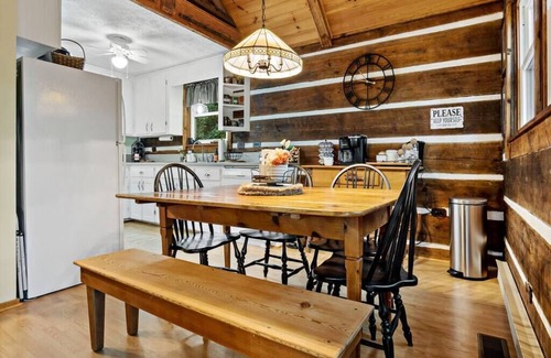 New Superhost Rental!!! Relax with the whole family at this immaculate, peaceful log cabin. Roam the wooded two acres, enjoy the serenity from our large front porch. Warm yourselves in the winter at our indoor gas fireplace or simply relax and help yourself to beverages at our Coffee/Tea bar in the dining area. Art/gaming/reading area for the little ones at the upper level landing and games under the coffee table in the living room for rainy days or a night in. Dogs welcome!