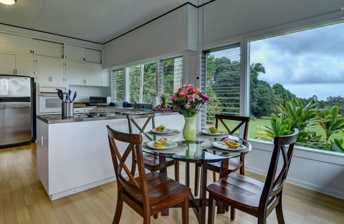 Enter the home onto the grand lanai (porch) which is fully screened in and offers a view of the manicured acre with Hilo Bay views in the distance. Through the front doors you'll be greeted by our huge living room. The original hardwood floors and plantation era architectural details are unique to Hilo homes from the 1920s and 1930s. This huge living area books on history and art of Hawaii, a large flat-screen TV, high-speed Wi-Fi internet and luxurious lounging area big enough for your whole family. NOTE: there are no TV channels so bring your streaming login info!