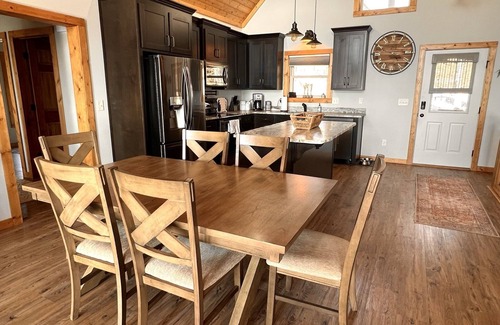 Comfortable leather sofas and chairs give you lots of room to enjoy the space, along with cozy blankets to snuggle up with. A dining table that comfortably seats 8 (just add the leaf) is ready for your whole family.