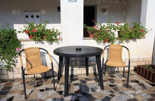 Apartment Livio II is situated on the ground floor of a family house, and it consists of a bedroom with double bed and one single bed, a kitchen with a dining area and a sofa, a bathroom with shower and a terrace with a beautiful view on the villages around and with sea view. The kitchen is equipped with a cooker with 2 electric and 2 gas plates and a refrigerator. There is a parking in front of the house and a garden. Young groups and pets are not allowed.