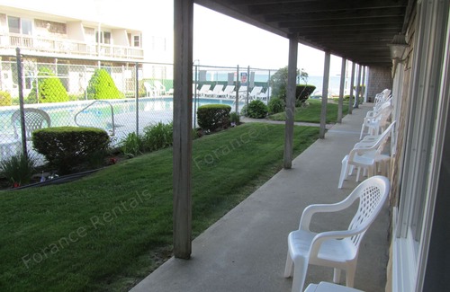 Our first floor end unit is located at opposite end of parking lot away from the cars and has it's own private entrance. The two large rooms include living room with futon, tv and updated kitchen; the bedroom has a queen bed along with it's own tv. It has a full bath and is Air Conditioned and is suitable for 2 but sleeps 4 using futon. There is an outside seating area in front of your unit and it's only a few steps to the seasonal outdoor heated pool; the beach is directly across the street from the complex as you will see in the pictures. Off street parking for one vehicle. Our complex is well maintained and professionally run with on site manager. BBQ area with gas grills, picnic table. Sorry, pets and smoking are not allowed. Pool is open from Memorial Day through Labor Day.
