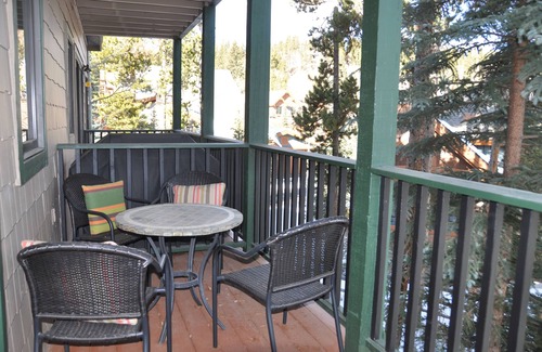 Fantastic updated ski-in 2 bedroom 930 sq ft townhome style condo. Park your car in private, attached one-car heated garage (plus one additional outside parking assigned). Just a 4 min walk to Breckenridge shops and restaurants. Guests can ski in to the complex from Peak 8 ski-down. Either take a short walk to the gondola or just steps to jump on the free bus to get to the slopes. Relax in complex shared hot tub or in front of the gas fireplace after a day of skiing or hiking. Unit is on two levels. The living and kitchen upstairs with 2 bedrooms and 2 full baths on ground level. Each level has deck surrounded by pines. Updated unit with fully equipped kitchen with quartz counters and stainless appliances. Reclaimed wood, chairlift cable railing. Private washer, dryer in unit.