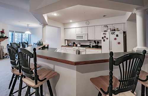 The townhome is on three levels. The main living area includes a large mudroom that allows for generous storage of ski gear. The sunny living room provides beautiful mountain views. The spacious kitchen is well equipped with an electric oven/range, refrigerator, microwave, dishwasher, and plenty of dishes, pots, pans, and utensils for cooking meals. The dining table seats 6 people comfortably. A bar height counter provides seating for an additional people. A bedroom with queen bed and adjacent bathroom rounds out the main living level.