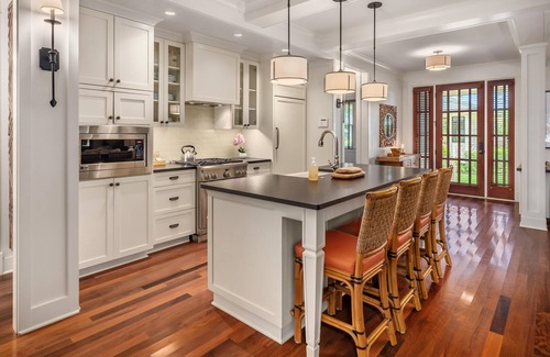 From the moment you step inside, you'll be greeted by tasteful interiors designed to enhance comfort and tranquility. The spacious open-concept living area features high ceilings, elegant tropical decor, and large windows that let in the warm Hawaiian sunshine. The living room is a perfect place to unwind, with comfortable seating and a flat-screen TV. The gourmet kitchen is fully equipped with everything you need to prepare meals during your stay, including top-of-the-line appliances, cookware, and a spacious dining area to enjoy your meals together.