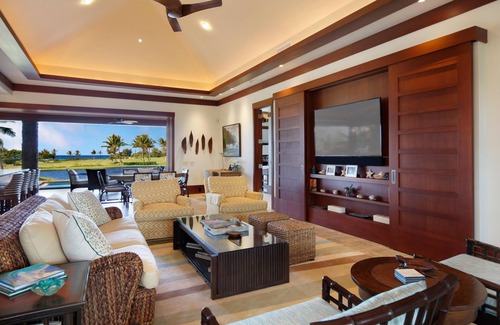 This stunning villa provides barefoot elegance and comfortable accommodations for up to eight guests across four bedrooms. Three bedrooms are found in the primary home with a fourth bedroom located in the detached 'ohana, provided a private oasis for guests that choose to stay in the 'ohana.
