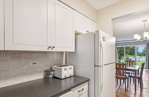 This comfortable two-bedroom condo is a one-level unit on the ground floor. Fresh and clean, it's the perfect spot to relax after a day of enjoying all that Stowe has to offer. The primary suite has a queen bed, and the second bedroom has three twins plus a trundle—an ideal size for a family getaway! The open-concept kitchen, living, and dining area is great for conversation and a gas fireplace keeps you warm and cozy. Sliding glass doors walk-out to a stone patio and kid-friendly lawn outside.