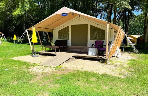 Equipment: The kitchen is equipped with hotplates, a fridge, a microwave and a coffee maker. The terrace has a garden furniture. To note : The lodge tents are located near the toilets. It is possible to book an additional tent for two people if necessary.