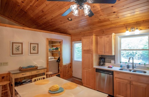 The vaulted rooms (including the bedrooms!) are light and airy, and we love the stylish decorating with a mix of modern farmhouse and a few well-chosen antiques. An open floor plan means your guests and family will be with the cook while watching television or socializing around the fireplace. Wood floors reflect the natural light.