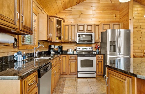Cedar Ridge features a spacious open floor plan, vaulted ceilings, and 2.5 acres of peace and quiet. Two comfy couches, Roku TV's with streaming capabilities, and stunning stacked stone gas fireplace adorn the living room. Your fully equipped kitchen has everything you need, including an electric stove and oven, microwave, dishwasher, refrigerator with ice maker, toaster, Keurig coffee maker, cookware, and dishes for everyone. A central island offers ample prep space and casual seating for two. The adjoining dining room comfortably seats six.