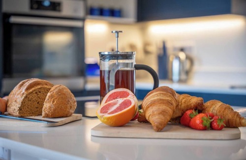 Step inside and you’ll find an expansive open-plan living area with vaulted ceilings and warm, natural finishes. The contemporary kitchen is a highlight, featuring quartz countertops, a central island, and top of the range appliances, ideal for anything from a celebratory dinner to a relaxed morning brunch. The lounge area offers cosy sofas, oak furnishings, a wall-mounted Smart TV, and striking LED globe lighting, creating an inviting and modern yet rustic atmosphere.