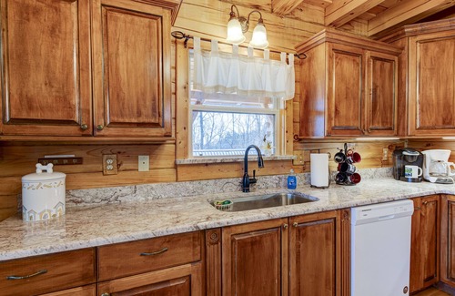 Rustic Elegance Abounds: Highrock Haven is a grand timber log home with spectacular views! This 3-story log home in the mountains blends old-world craftsmanship, with modern convenience! Cozy-up to the 52” wood burning fireplace or prepare a feast in the country kitchen. With four spacious bedrooms and three luxurious bathrooms, this home is a great place to have a gathering with family or friends. Richly decorated, the living room features a leather reclining couch with a matching leather rocking/recliner couch, a beautiful stone fireplace, and a state of the art new 55"' wide screen SMART TV ( with the Apps ) / BLUE RAY player and Direct TV and plenty of DVD's. On the main level is the fully equipped kitchen, and the dining room area with a hand crafted pine table, custom made to comfortably seat 10 people. Enjoy the fun of 'grilling out' on the convenient gas grill, located on the spacious deck, overlooking gorgeous views. After dinner, enjoy a glass of wine while soaking up the stars in your 5-person hot tub.