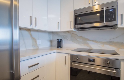 The kitchen is just right for a vacation getaway. All new and decidedly modern, this sleek space offers up all necessary dinnerware, cookware, and appliances large and small. Efficient pantry closets make the most of their space, and there is even a stacked washer and dryer in its own closet space too.