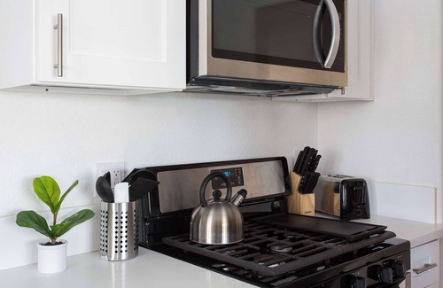 ▸ Full size refrigerator, microwave, stove, oven, coffee maker, toaster