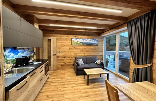 The Rezidence Krakonoš 101 offers a 3-room apartment on the ground floor, ensuring convenient access during your vacation. The spacious and luxuriously furnished living area features a dining table and television, providing a comfortable space to unwind. Additionally, there is an exit leading to a terrace from the living room.