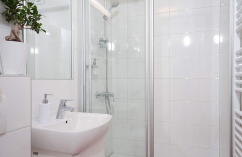 This "mini penthouse" contains a bedroom with one king size bed and a sofa-bed (for extra person), a kitchen with a dining room and all necessities, as well as a bathroom with a spacious shower. Also, there is a large built-in wardrobe with a lot of space for storage in a hallway.