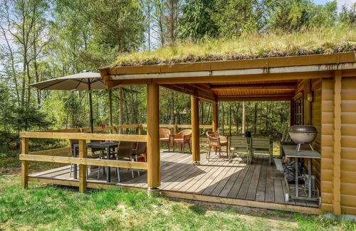 On an idyllic nature plot awaits you this wooden house at Als Odde Strand. The heart of the house is the living room with access to the beautiful terrace overlooking the water. Relax here in front of the fireplace after a long day in nature and leave everyday life behind. The long dining table in the living area invites you to cozy dinners or game nights. You also have two bedrooms with a double bed and bunk beds and a bathroom at your disposal.