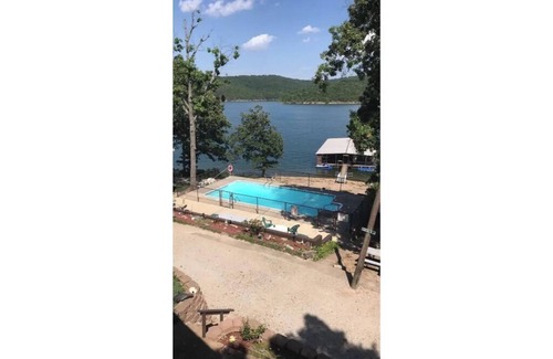 Wake up to views of Table Rock Lake in this private lower level two-bedroom cabin. 1 Queen Bed, 1 Bunk Bed, and 1 Pullout couch. Enjoy overlooking the water, cook in the full kitchen, and relax on the deck or pool. Just steps from the dock. Perfect for fishing, boating, or unwinding. Boat slips available for rent upon request.