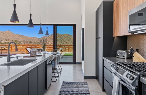 Experience this newly-built modern architectural gem located on an acre of hilltop desert landscape. Enter the front door and take in the bright open living space with breathtaking views of the Joshua Tree mountains and valley. Slide open the retractable floor-to-ceiling glass doors to transform the living room and dining room into an indoor / outdoor sanctuary. Take in the stars and sweeping views of the desert and mountains as you soak in the hot tub (heated 24/7 for your enjoyment), relax on one of the outdoor lounge chairs, or enjoy a meal at the large outdoor dining table. The large fire pit sets the perfect scene to make s'mores and share stories.