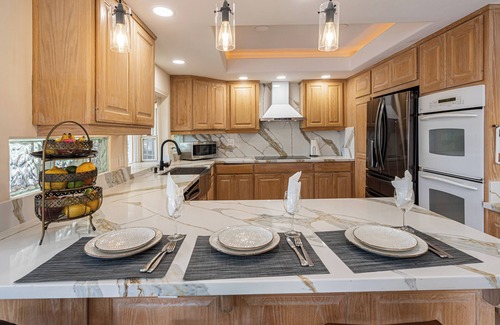 Fully equipped kitchen with double wall oven, induction cooktop, French door refrigerator, instant pot, air fryer, food processor, coffee maker