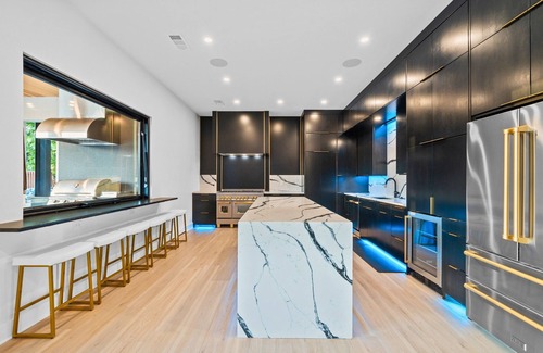 Rockstar offers an impressive culinary setup that promises to enhance every dining experience. On the lower level, the primary kitchen boasts state-of-the-art appliances and a large granite-topped island, making it perfect for preparing gourmet meals and facilitating easy social interaction during food preparation. Enhanced by dark wood cabinetry and customizable LED lighting, this space exudes elegance and functionality. An outdoor kitchen adjoins this area, ideal for grilling and enjoying meals in the fresh air, creating a seamless flow between indoor and outdoor entertaining. Upstairs, a conveniently located mini kitchen serves as a perfect spot for quick snacks and refreshments, ensuring comfort and ease throughout your stay.