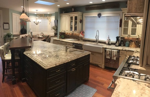Large Chef's Kitchen with an open floor plan, lots of seating and natural light, great for entertaining.
