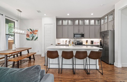 This stunning, spacious new build is perfect for your Dallas getaway! Settled right in the heart of the up and coming Trinity Grove District - close to bars and restaurants, minutes from Downtown & Bishop Arts District. Four bedrooms featuring 2 master suites and an upstairs loft area with a mini foosball table and a futon couch for extra sleeping. Quaint backyard perfect for your fur babies. Large couch in living room can also sleep 2 people comfortably, plenty of space for everyone π