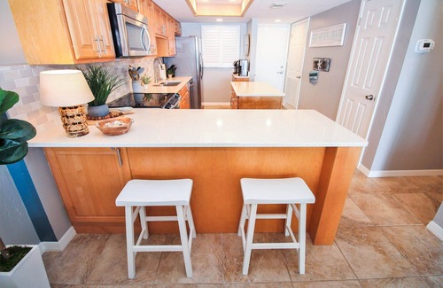 As you settle in, step into the updated kitchen to unload your groceries. This space is updated with stainless steel appliances, granite countertops, subway tile backsplash, and warm cabinetry. Coffee lovers will immediately gravitate to the coffee bar that is equipped with both a drip and Keurig coffee maker. Though NSB has fantastic dining nearby, you'll love the occasional meal made at home. The condo is stocked with cooking essentials, dinnerware, a toaster oven, crockpot, blender, and more.