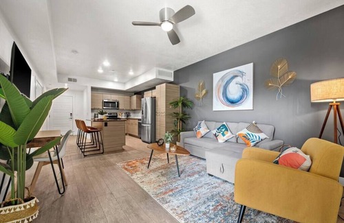 Experience luxury in our spacious apartment located in the heart of SLC. Enjoy stunning mountain views from the open floor plan and modern bohemian decor of the spacious living area with a large flat-screen TV. The fully equipped kitchen and en-suite bathroom with a luxurious shower make your stay comfortable. The central location puts you just steps away from restaurants, bars, entertainment venues, university, hospitals and convention centers. Book now and enjoy the best of Salt Lake City.