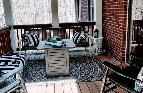 Peace and quiet. Beauty and function. Stretch out and enjoy this 1900 square foot luxury 'apartment' - - the whole main level of this beautiful Milton home. Your separate entrance opens into your spacious open concept living room/kitchen which separates a king executive suite from two bedrooms and bath, all tastefully decorated in a comfortable, eclectic mix of antique and modern furnishings. Hardwoods floors, granite counter tops, copper sinks, clawfoot tub, jacuzzi, walk-in shower, huge cherry top island, fireplace, treadmill, beautiful decor, screened porch, hammock, and rocking chair veranda - all nestled in the woods!