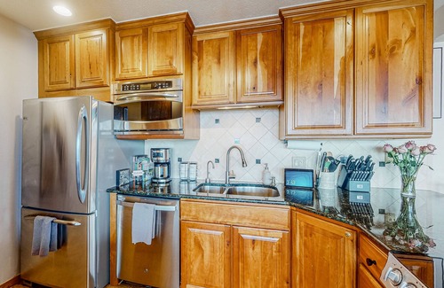 This two-bedroom condo, tucked into a peaceful neighborhood, makes for the perfect family vacation or friends' weekend, no matter the season. The top-floor location of the condo means you can expect a quiet stay and a stunning mountain view that greets you immediately, thanks to the floor-to-ceiling windows and balcony – the perfect place to start the day with coffee or end it with a cocktail.