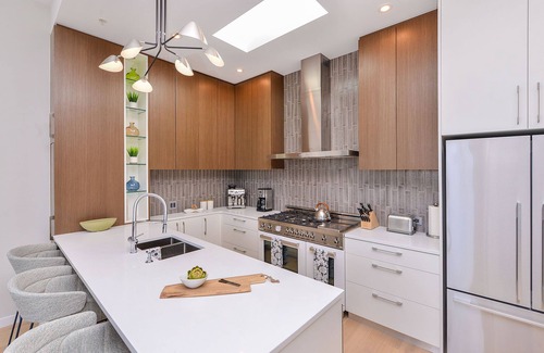 The experience of staying at the Oak Bay Executive Penthouse begins with the curb appeal of the Bowker Collection building itself. Completed in 2020 by the prestigious Abstract Developments, the building reimagines the possibilities of new developments for heritage areas like North Oak Bay. The penthouse itself, designed by the award-winning Sandy Nygaard, is an open plan design with over height ceilings making the home bright and airy. The shared living spaces include a lovely, spacious kitchen, a comfortable living room and a modern dining area with incredible views.