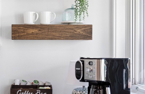 The convenient sink area includes a Keurig Coffee maker, coffee mugs, wine glasses, and a corkscrew. A wine and beer cooler is also available. Room-darkening shades ensure a restful environment day or night.