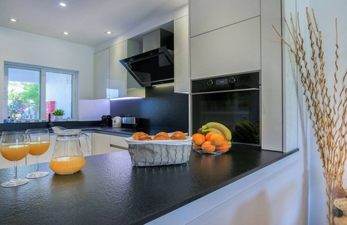 The kitchen is fully equipped with appliances such as dishwasher, hob, fan assisted oven, washing machine, fridge freezer, microwave, kettle, toaster, iron and ironing board, saucepans and cooking utensils, fully fitted units and window overlooking heated swimming pool and garden.
