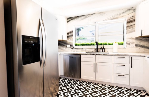 Unleash your inner chef in our fully-loaded kitchen. The dining space, inspired by Beverly Hills, seats eight amidst palms and flamingo pink touches.