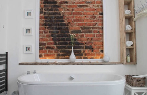 Bedroom 2 is a double/twin with a lovely patterned luxury padded headboard and a free standing back to wall bath. The wall behind the bath is old bricks framed. White wooden blinds and painted wooden floor.
