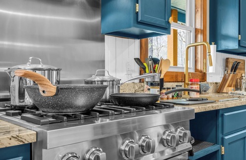 You enter through the main door off the deck and into the vaulted ceiling living room and dining room. Your entertaining space is palatial with dining for 10 on a gorgeous stone table and a chefs kitchen. Plenty of room for preparation and hanging out. Every utensil and every size pot and pan is provided. You will cook and bake like a pro with the the Zline Propane stove, oven and hood vent.