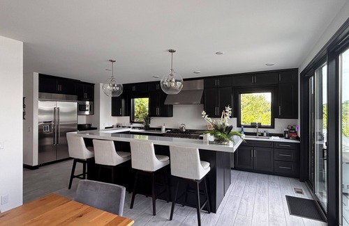 Step into our beautifully furnished main floor and take in stunning lake views from the moment you arrive. The open-concept living area features a cozy seating space, fireplace, and large TV—perfect for relaxing together. Gather around the modern wood dining table that seats 12, or cook up a feast in the chef’s kitchen with high-end appliances and a two-tier island. Just down the hall, you’ll find a walk-in pantry, a half bath with urinal, a full laundry room, and a convenient wet bar with an ice maker and coffee bar.
