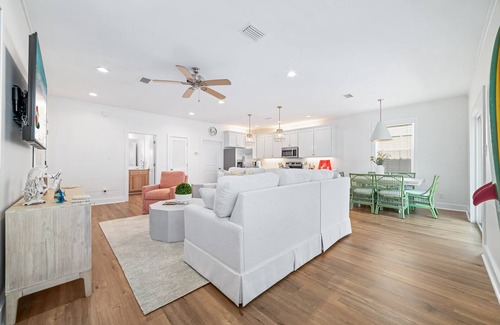 Welcome to Happy Ours – a bright and breezy 3-bedroom, 4-bathroom fully remodeled beach cottage located just one block from the white sands of Gulf Shores. This beautifully updated retreat with all new furniture features two outdoor pools, private parking for up to four vehicles, smart TVs, a modern kitchen, and easy walkable access to restaurants, shopping, and entertainment.