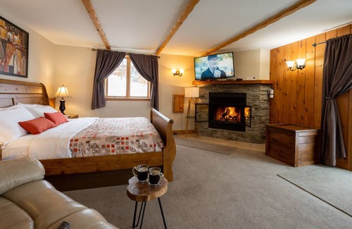 Features an open concept studio for 2 people with a cathedral ceiling, king bed, whirlpool bath, fireplace, sauna, kitchenette, cable TV, free WIFI and 1 bathroom.