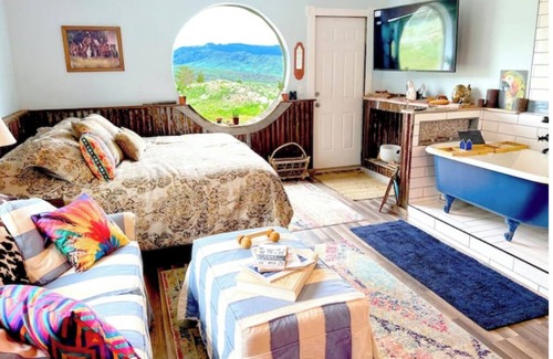 Retreat to the fire pit of your luxurious healing farm cabin with your very own giant round hobbit window and gaze at the twinkling night sky, unparalleled majestic views or play with the goats.