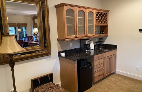 Master on main has a comfortable luxury king size bed with private sitting area, lots of storage with an armoire and night stands, the en-suite has double sinks, a jetted tub, walk in shower, and his and her closets.