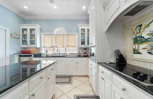 The gourmet kitchen features granite countertops, custom cabinetry, stainless steel appliances including a fridge with ice dispenser, plus all the cookware, dishware, utensils and small appliances needed to prepare a culinary masterpiece.