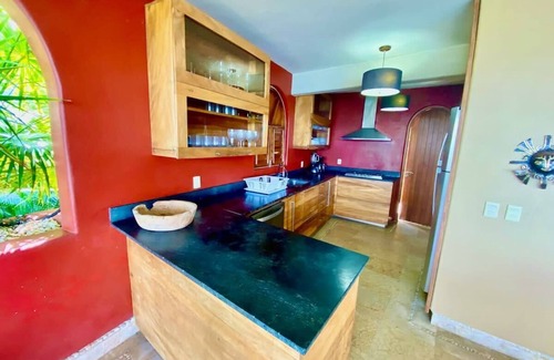 The main level of the house boasts a tropical ambiance with a unique palapa roof that adds a touch of exotic charm. The kitchen comes fully equipped for all culinary needs, including a gas BBQ for outdoor grilling. The living area offers a comfortable hanging bed to enjoy breathtaking sunsets and a large sectional sofa for relaxation. The entire house is equipped with WiFi, ensuring connectivity throughout your stay.