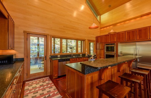 Antler Ridge is a 5BR/5BA custom home with over 5,000 square feet of luxury finishes and high-end furniture. Before stepping inside, note the putting green just a few feet away from the front door. This home boasts high vaulted ceilings and an open floor plan where the living room, formal dining area, and kitchen flow together. Located on a private lot in the upscale community of Yonahlossee Resort (gym, indoor pool, and indoor/outdoor tennis courts), this home has fantastic access to both Blowing Rock and Boone. The three-story home includes huge windows, stone fireplaces, Brazilian Cherry floors, Cherry cabinets, stairs, railings, and Cherry wood trim. In case of a power outage, it is equipped with a backup power generator to continue your vacation even in unlikely circumstances. Downstairs you'll find a pool table, ping pong table, and recessed hot tub on the lower deck. The gourmet kitchen features high-end appliances, granite counters, and is well-stocked for cooking. Five bedrooms offer a regular bed and privacy for all guests. Each bedroom offers ample space for everyone while on your vacation.
