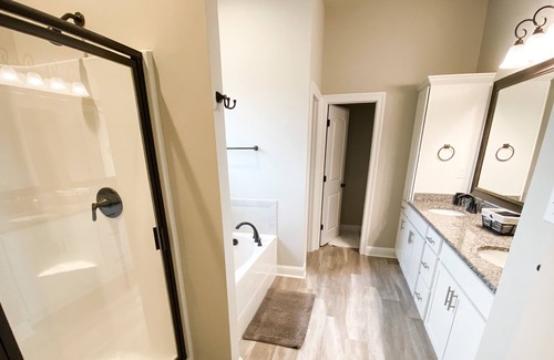 Enjoy a stylish experience at this two-story centrally located home. We take pride in our cleaning regimen and ensure this home will exceed your expectations. Master Suite on the first level with luxurious en suite. A large 65" smart TV and open main living area make this property one the whole family will enjoy. In the garage, you will find a foosball table, corn hole set, play tent, and other family-friendly fun. The garage opens and faces a stocked pond with relatively private surroundings.